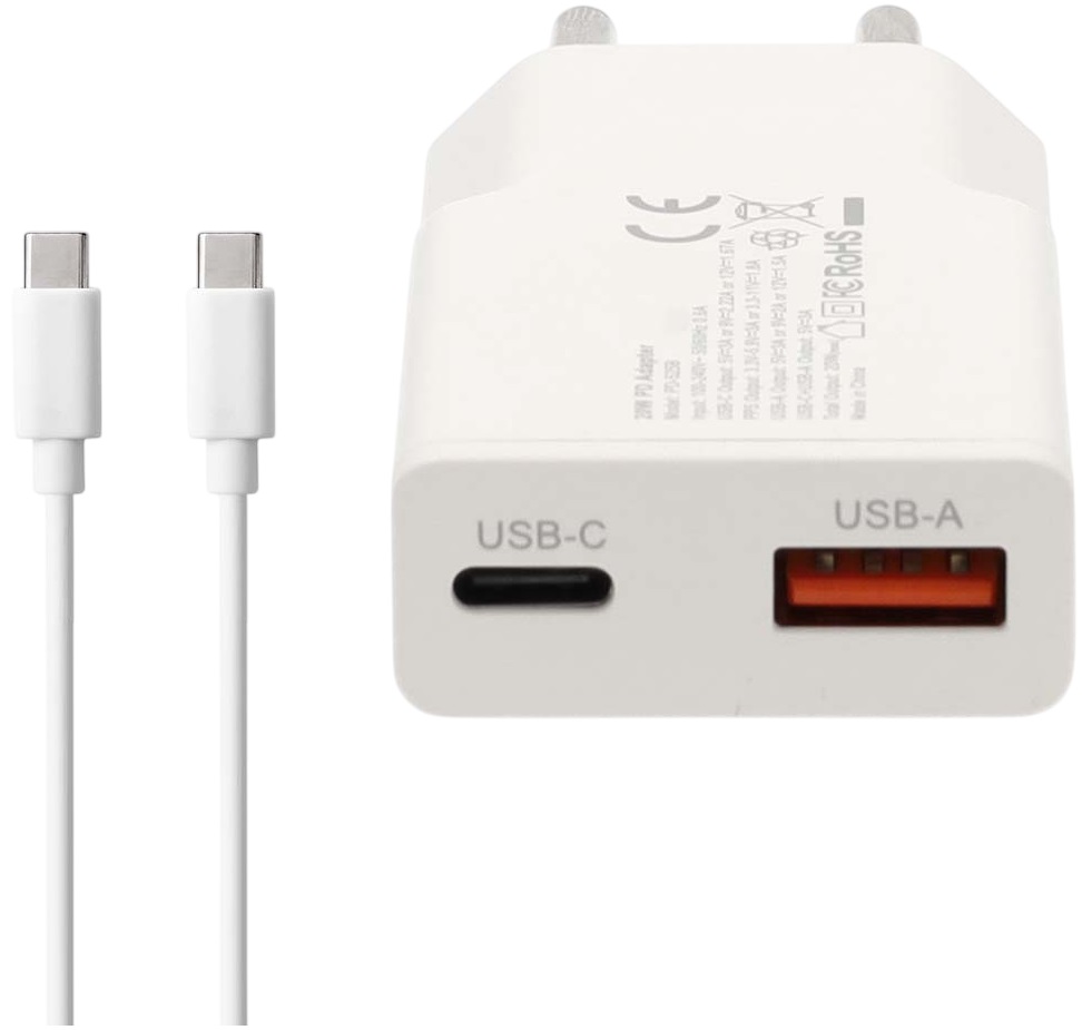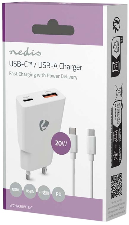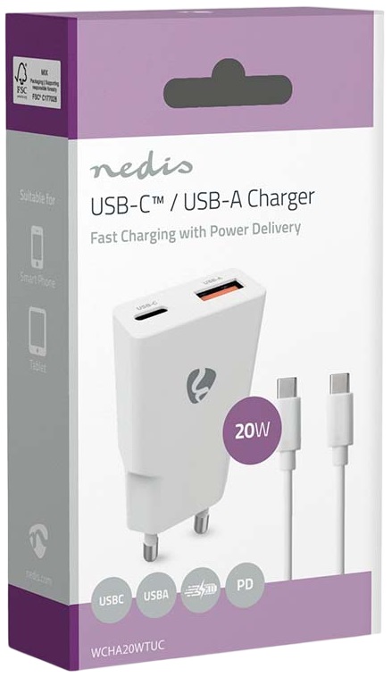 Carregador Universal 1x USB-A + 1x USB-C Carregamento Rápido 20W (Branco) - NEDIS