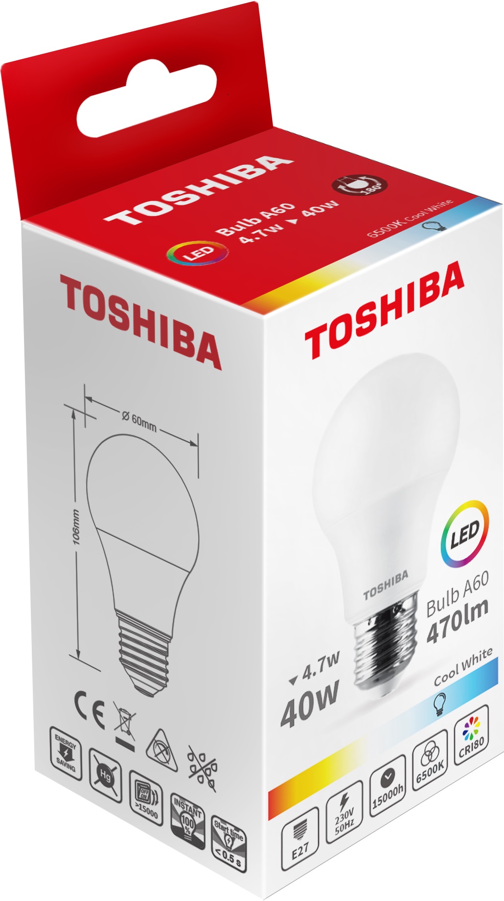 Lâmpada LED E27 A60 4,7W 6500K 470Lm - TOSHIBA
